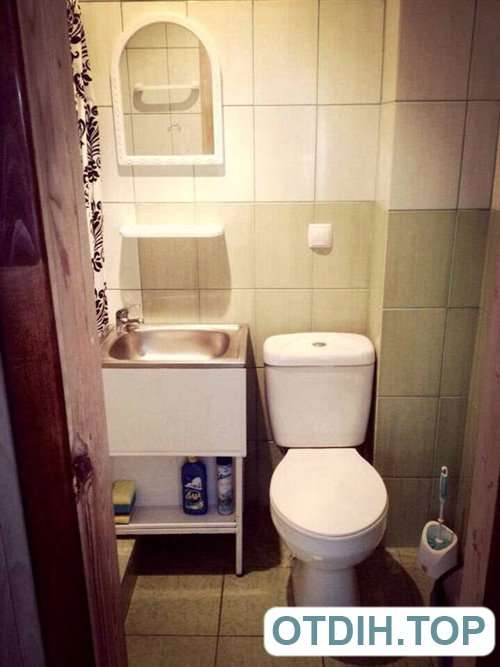 Практически все номера б/о «Доминика» в Кирилловке обустроены отдельным туалетом. Здесь кроме унитаза находится умывальник, современный гидробокс и зеркало, помогающее быстро убрать все следы сна или лишней растительности с лица отдыхающих.