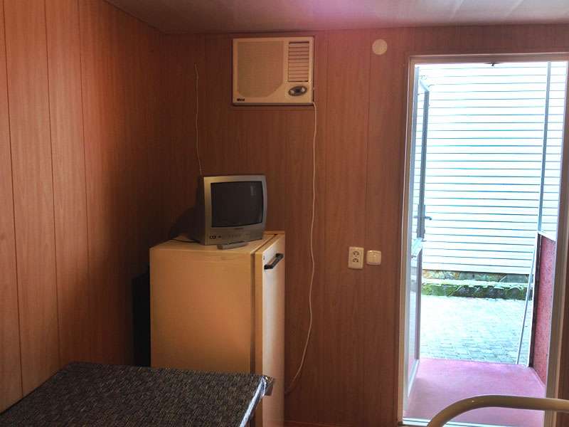 Кондиционер, холодильник, телевизор; Умывальник и туалет в номере; Душ (горячая вода) на территории базы отдыха;