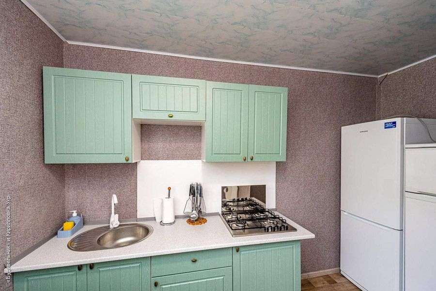 Кухонный гарнитур, 4-х конфорочная газовая плита, СВЧ-печь, духовой шкаф, кофеварка, электромиксер, электрочайник, два больших двухкамерных холодильника, полный комплект посуды для приготовления и приема пищи.