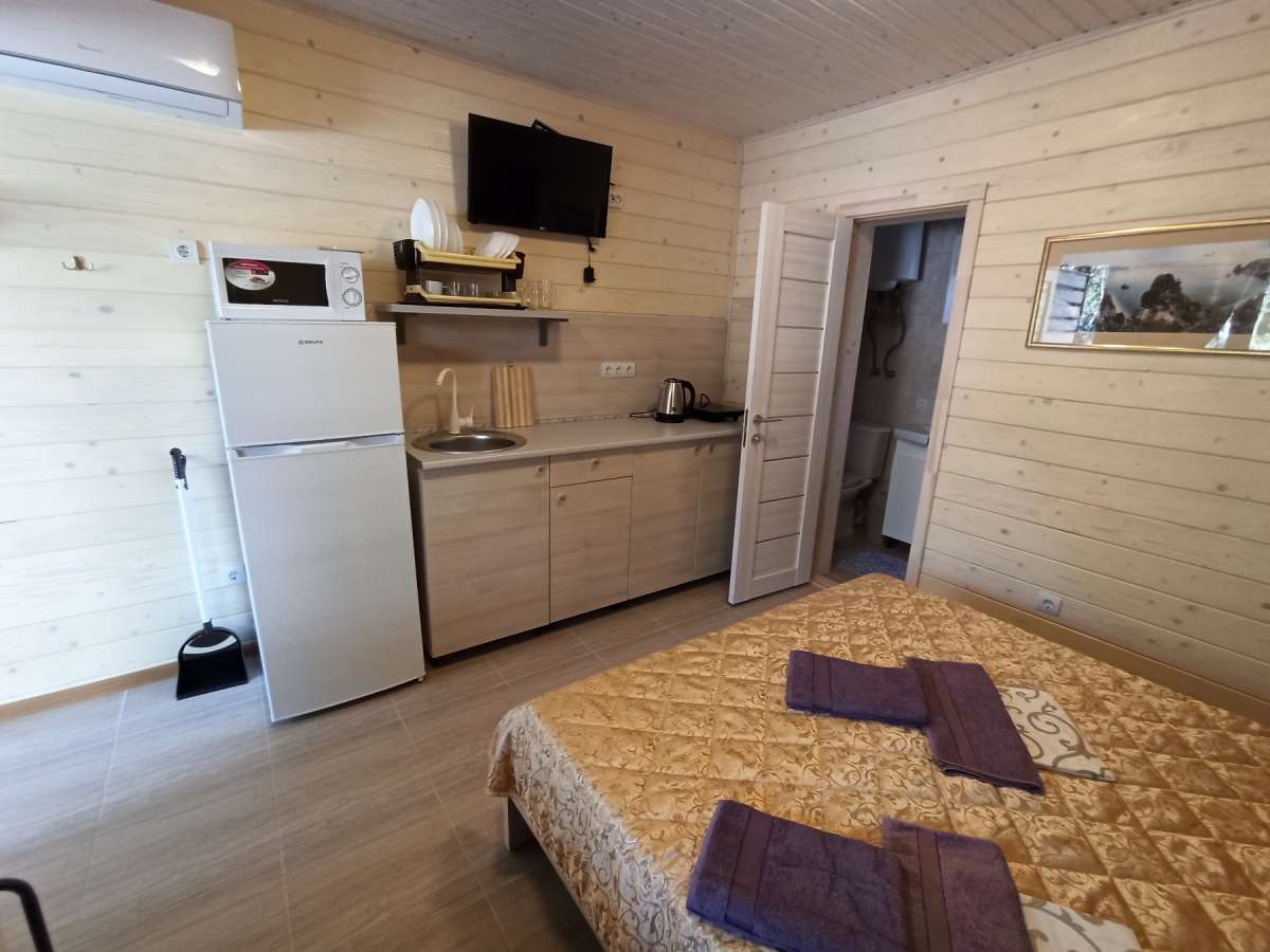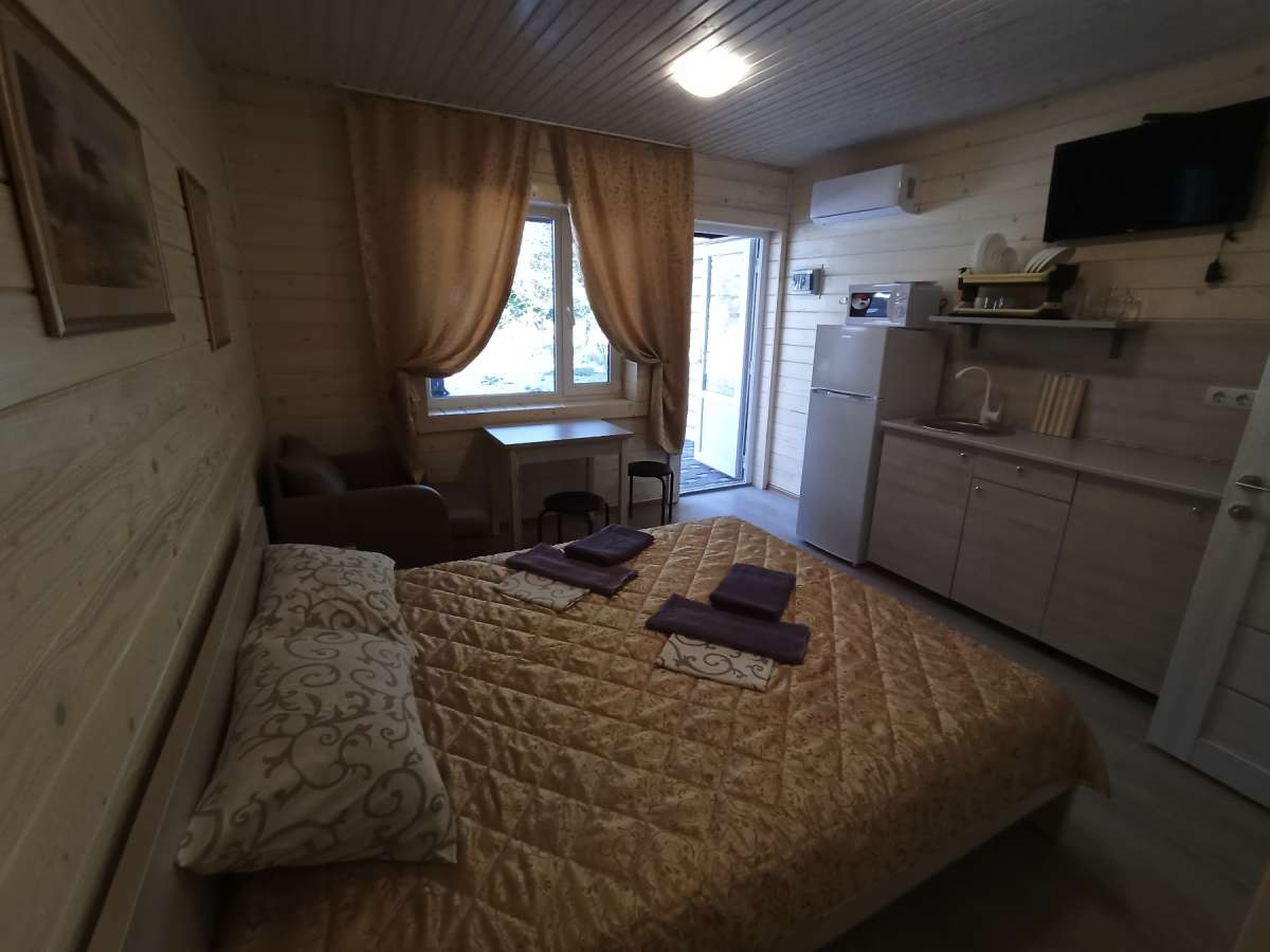 В номере: одна комната-студио, двухспальная кровать + диванчик, кухонный блок, посуда, Х, эл. печка, эл. чайник, СВЧ, К, ТВ, В/нагрев., полотенца, москитки, УДТ. Питьевая вода в номере. Терраса со столом и стульями. Мангал, шампура, стоянка для автомобиля. Заезд в 13:00, выезд в 11:00