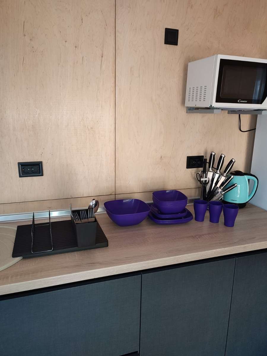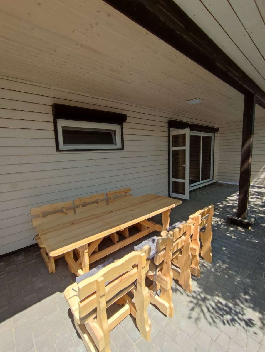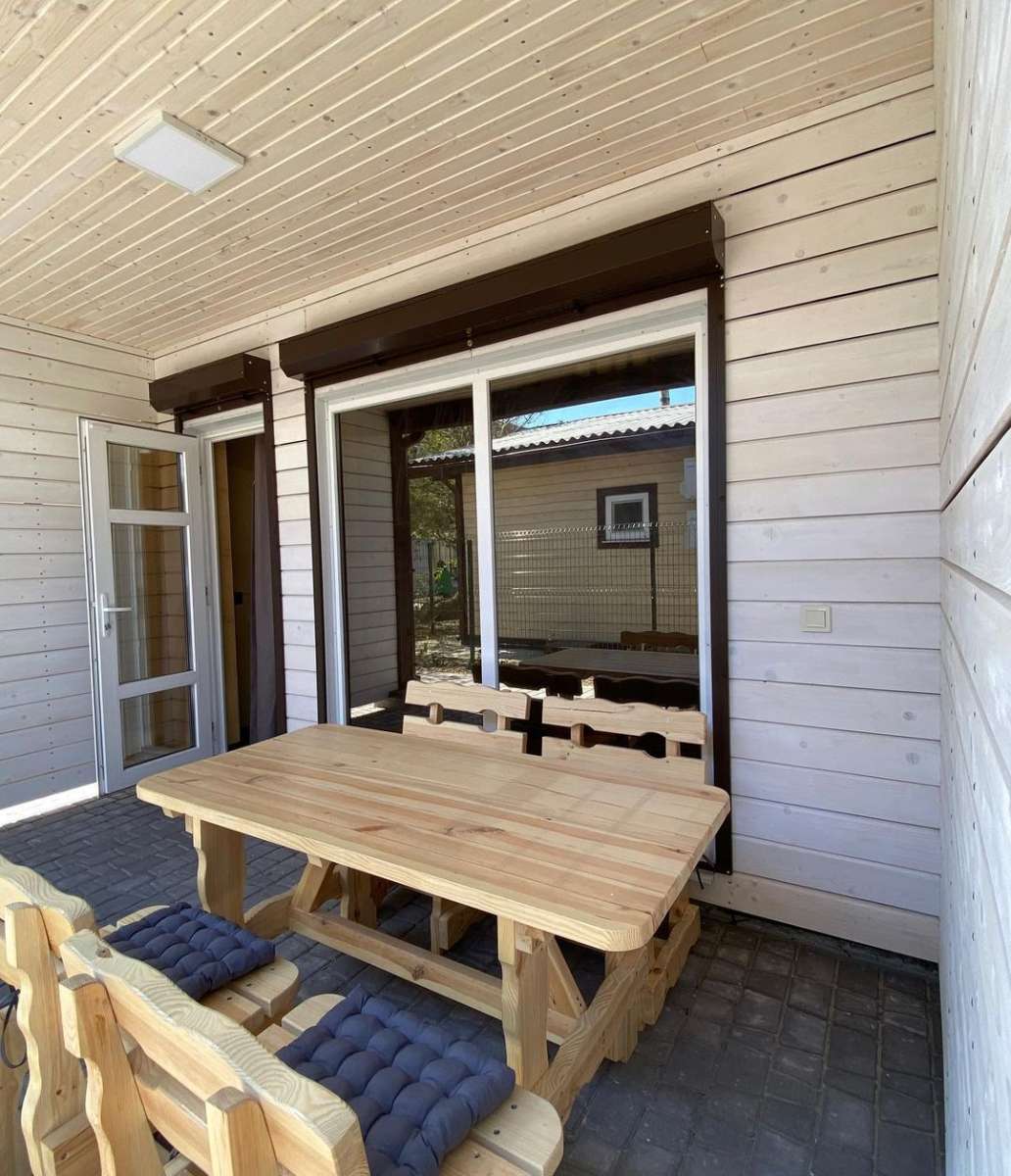 №3 — 6тиместный: Кухня-студио — Кухонная стенка, эл.печка, эл.чайник, посуда, СВЧ, Х, К, ТВ, В/нагр., полотенца, 2-хспал.диван, УТД. Спальня — 1+1 кровать, спальня — 2-хспальная кровать. Терраса со столом и стульями. Мангал. Стоянка для машин. Заезд в 13.00, выезд в 11.00