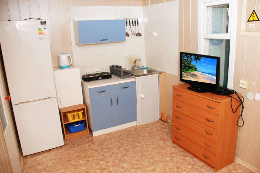 Круглосуточная подача горячей (бойлер) и холодной пресной воды. В каждом коттедже: Спальня. Мебель: три односпальные кровати (можно сдвигать), сплит-система, мебель. Имеется комплект полотенец и пледов. Кухня-гостиная. Мебель и оборудование: кухонная мебель, электроплита, двухкамерный холодильник, раскладной диван, LCD-телевизор, полный комплект посуды для приготовления и приема пищи. Санузел. Оборудование: душевая кабина, унитаз, умывальник. Небольшая веранда. Персональная беседка