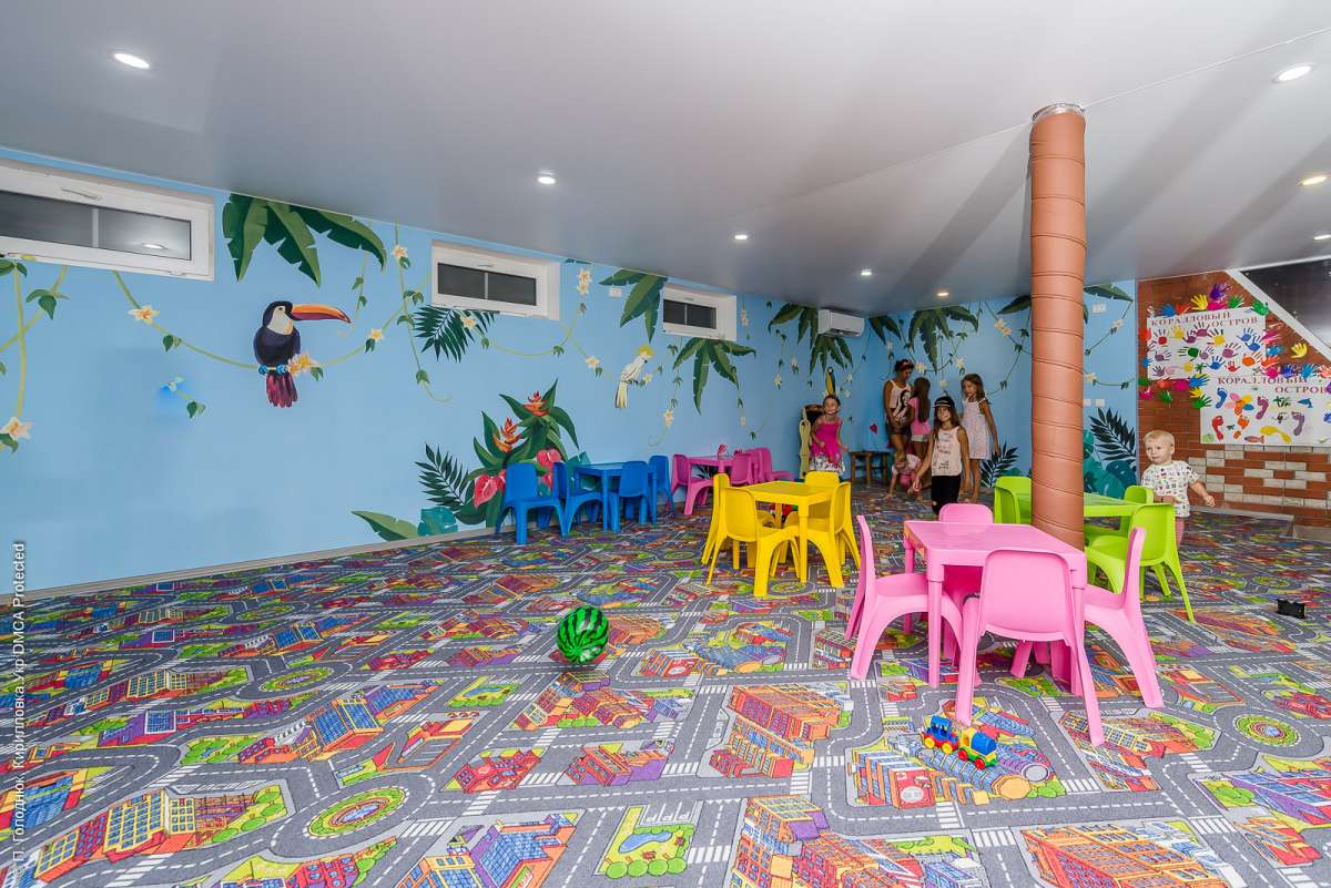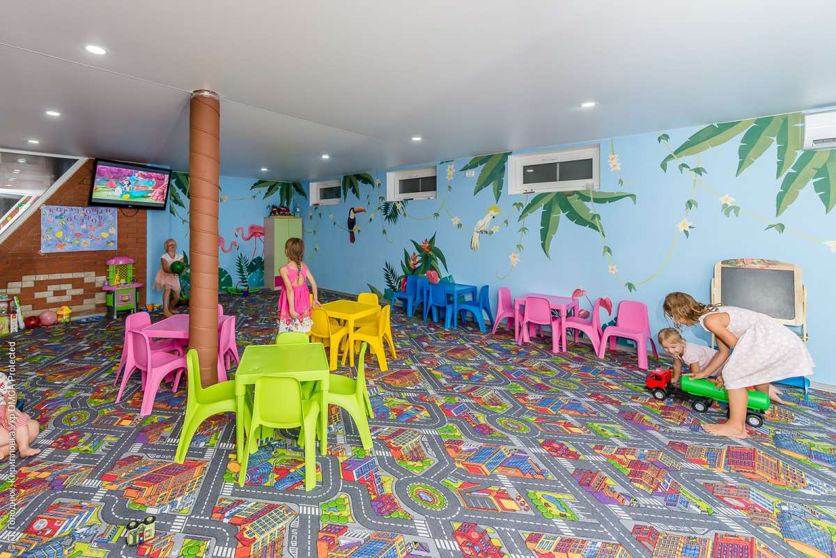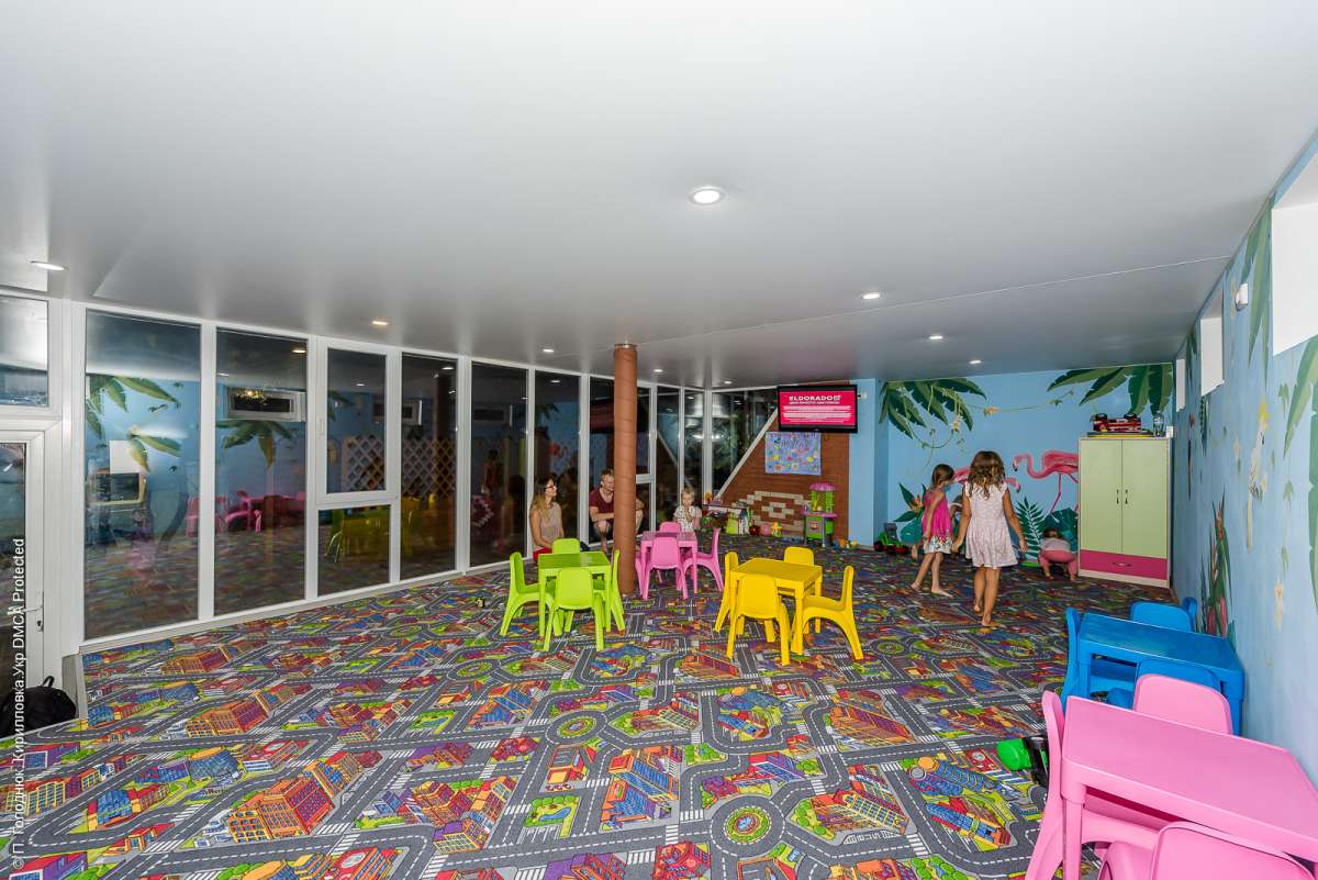 Для наших маленьких посетителей мы предлагаем большую детскую комнату с аниматорами, которые будут развлекать малышей множеством различных игр и викторин. Для комфорта малышей по желанию бесплатно предоставляются детские столики, стульчики для кормления и детские кроватки в номера. Так же в бассейнах есть детская зона для безопасного купания.