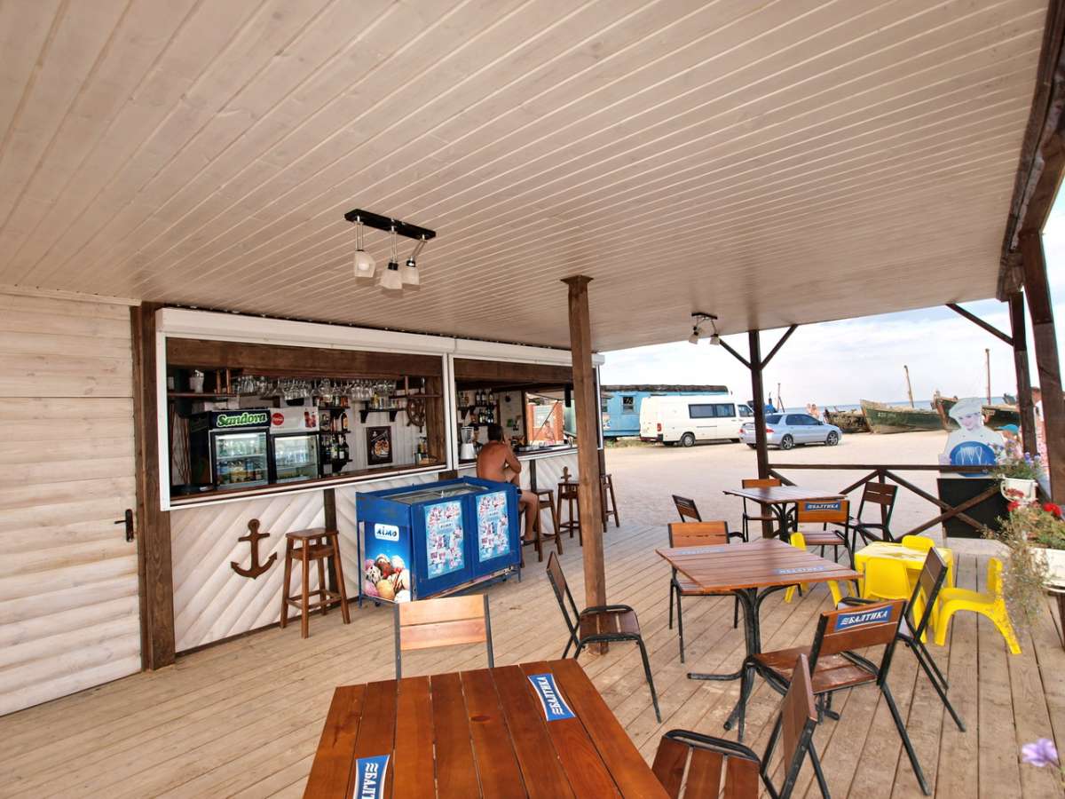 База так же имеет свой собственный пляж, оборудованный навесами защищающими от солнца, и шезлонгами для комфортного отдыха. На пляже поддерживается чистота и порядок. Так же посреди пляжа работает бар и пиццерия, пляж обслуживается официантами по этому вам необязательно покидать свой шезлонг для того что бы перекусить либо охладиться прохладным напитком вас обслужат официанты.