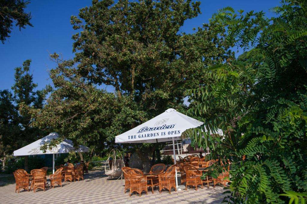 На территории имеется садовая мебель, терраса, сад, детская площадка, фотозоны. Территория озеленена, а также благодаря тому, что отель расположен в парковой зоне с многолетними дубами добавляет изящности и красоты.