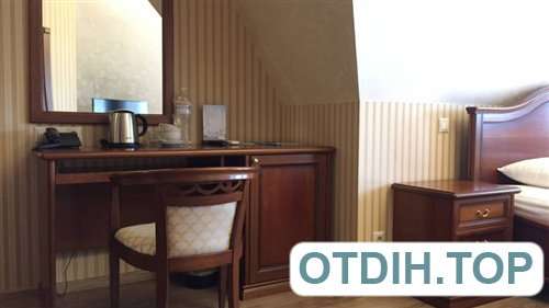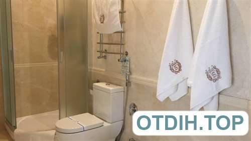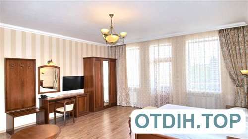 Номер состоит из: двуспальной кровати размера king size, дивана, журнального и письменного столов, сплит-системы, плазменного TV, мини бара, санузла, укомплектованного набором полотенец и банными халатами. В номере также есть: сейф, фен, чайный набор (электрический чайник+посуда). Утюг и гладильная доска - по запросу гостя.