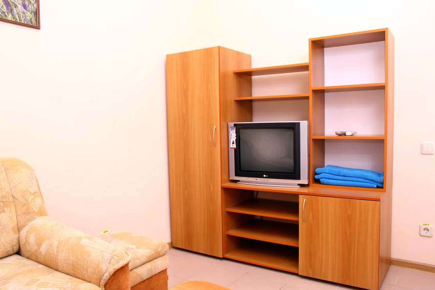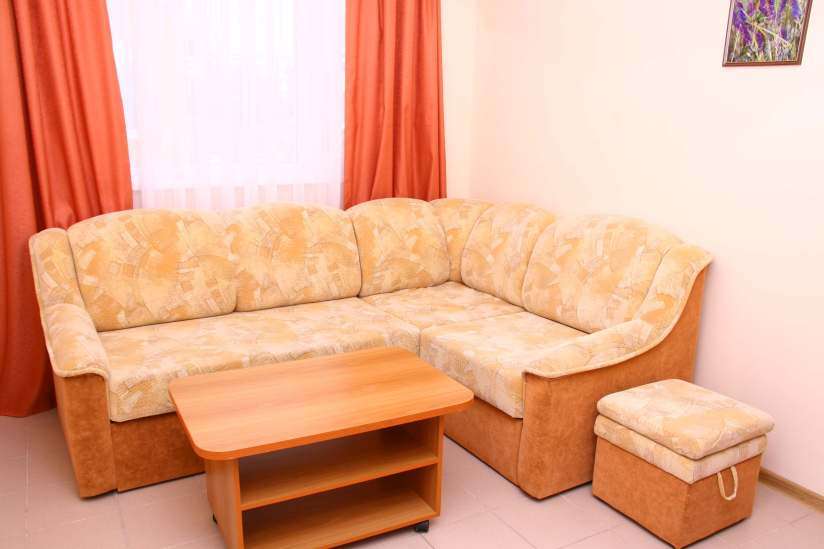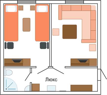 Номер Люкс – это комфортабельный номер, рассчитанный для проживания от 2-х до 5-ти человек. Номер состоит из спальной комнаты, гостиной, коридора и душевой комнаты. В спальне располагаются две односпальные кровати и модульный шкаф. В уютной гостиной мягкий уголок, который при необходимости раскладывается на 2 спальных места.