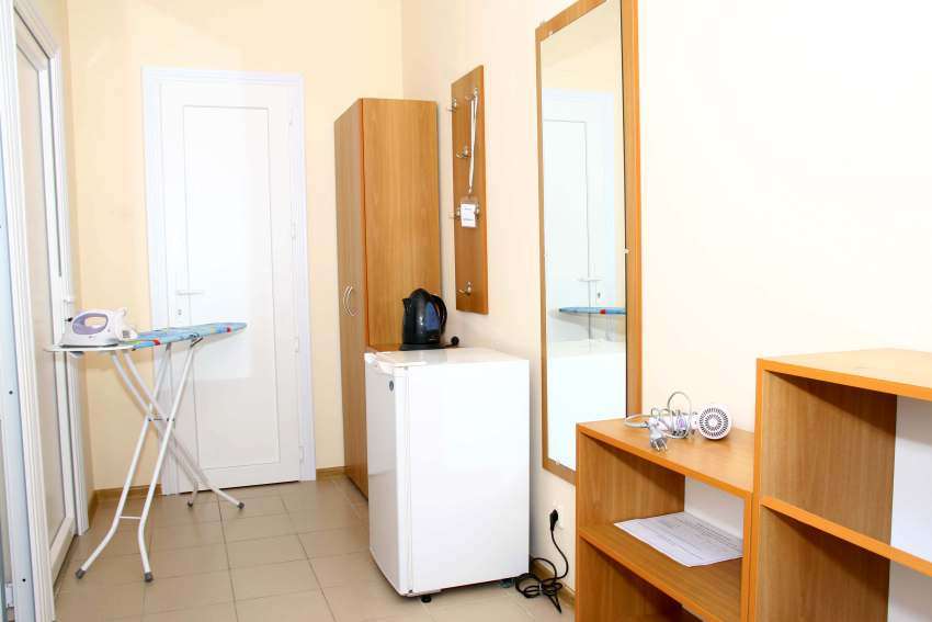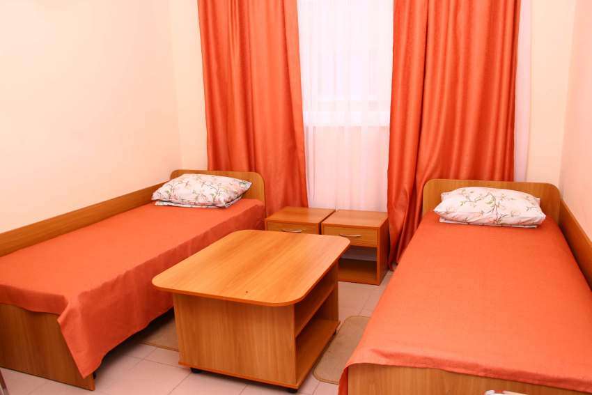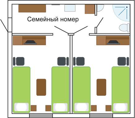 Семейный номер состоит из 2-х спальных комнат, коридора и душевой комнаты. Спальные комнаты совершенно одинаковые, в каждой располагаются 2 односпальные кровати и модульный шкаф.