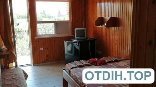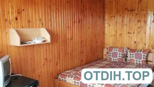 Кухонный угол включает в себя обеденный стол, холодильник и электрочайник. Приготовление пищи возможно на общей кухне расположенной на территории базы отдыха.