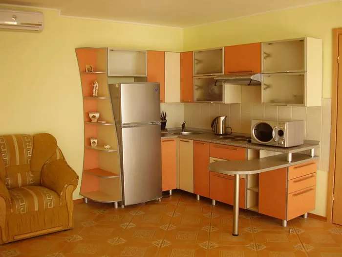 Гостиная: мягкая мебель, кухня (эл. чайник, эл. плита, микроволновая печь, холодильник, посуда) кондиционер, телевизор с кабельным TV, видеосистема + DVD.