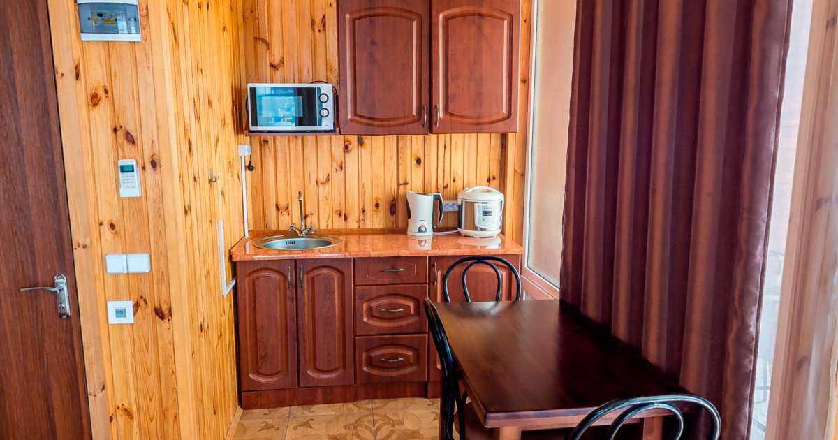 Комплектация кухонной зоны номеров: двухкамерный холодильник, мультиварка, микроволновая печь, электрочайник, полный комплект посуды для приготовления пищи.
