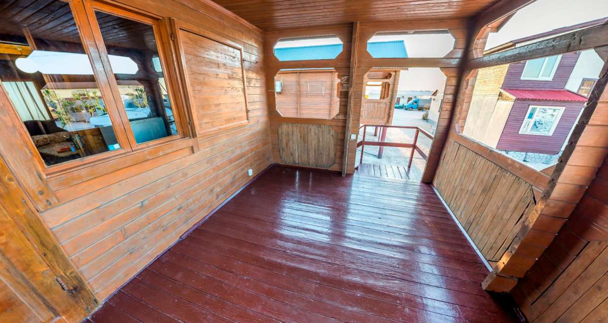 Отдельно стоящие деревянные срубы, состоящие из: двух раздельных комнат, кухни, просторной летней террасы и санузла. Под домиком есть возможность поставить два автомобиля.