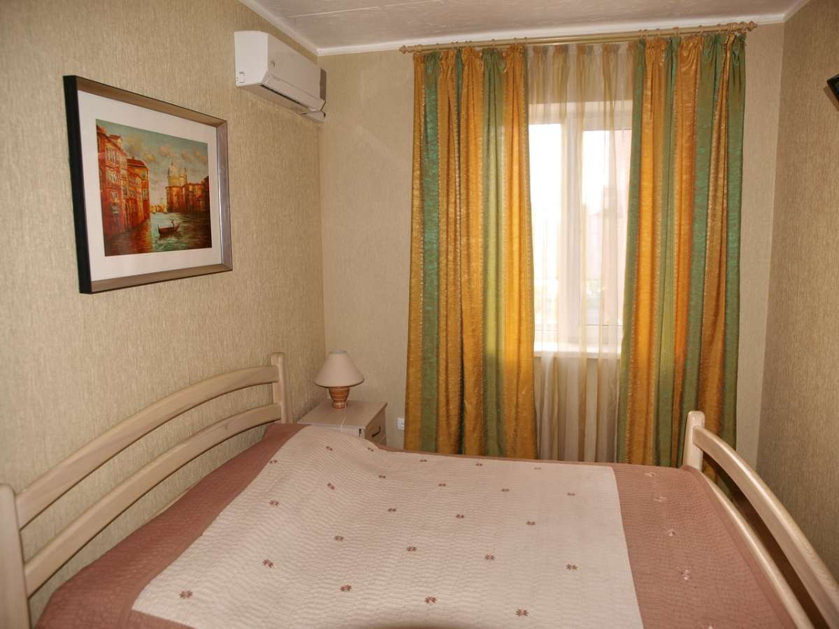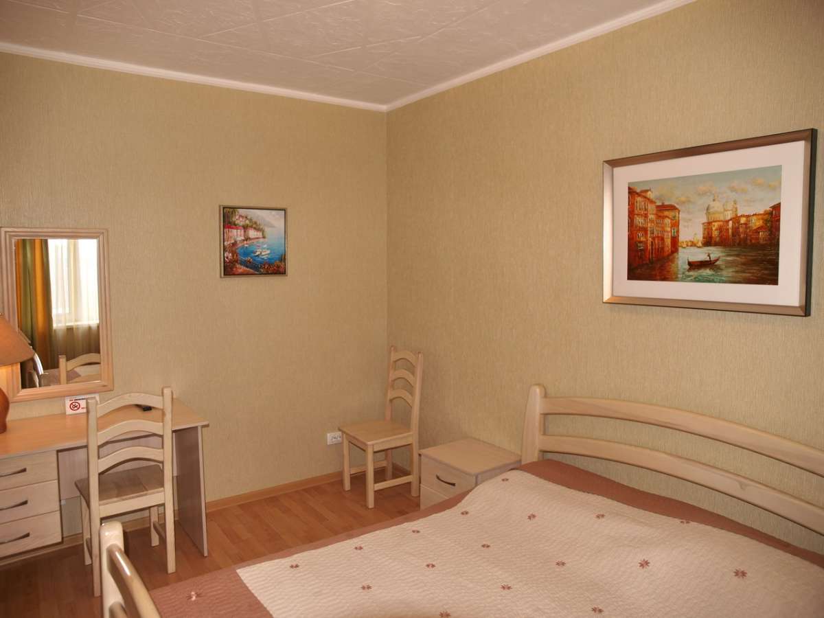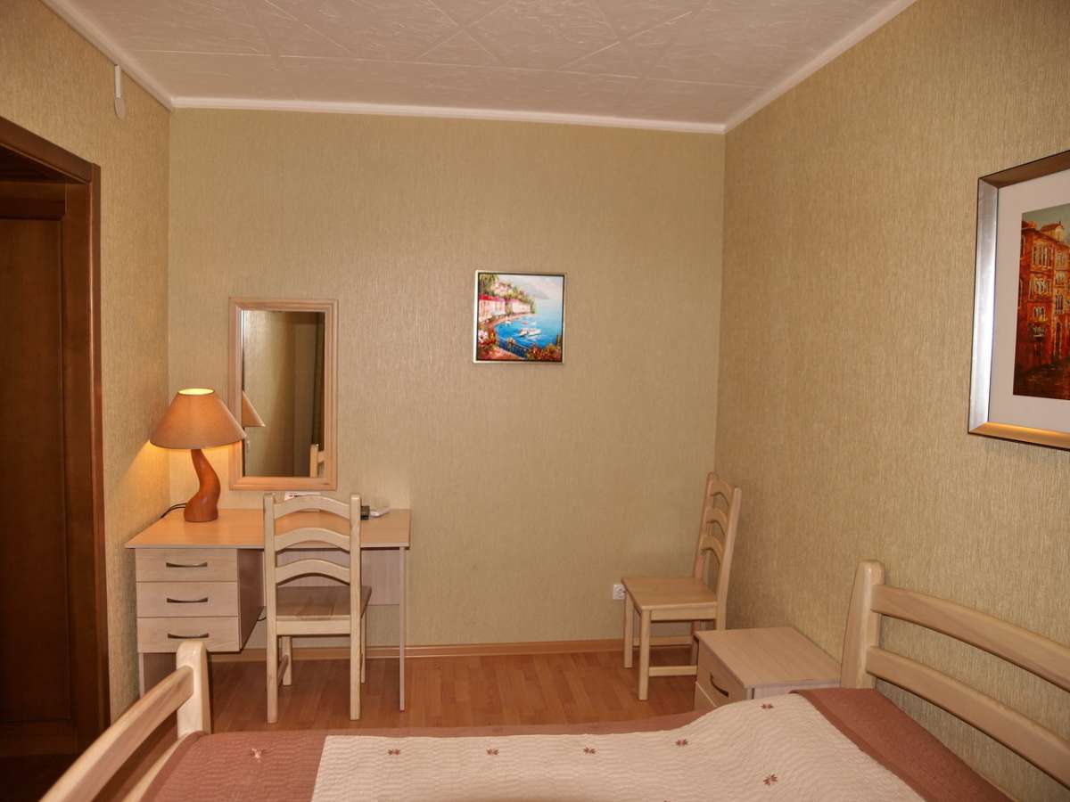 Однокомнатный двухместный номер без балкона. В номере есть кондиционер (сплит-система), холодильник, чайник, плазменный телевизор со спутниковым ТВ, красивая современная мебель: шкаф, тумбочки, двуспальная кровать, декор, шторы, ламинированный пол. Санузел с душевой кабиной (круглосуточное горячее водоснабжение), умывальник и унитаз находятся в номере. Отдыхающим предоставляется постельное белье и полотенца высокого качества.
